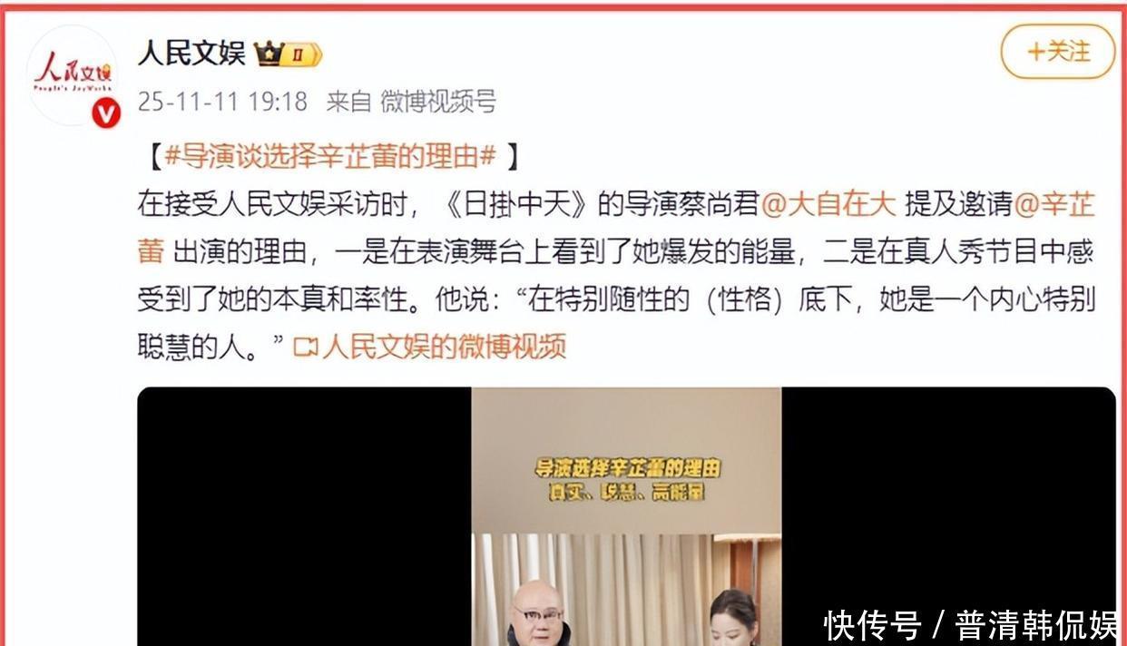 第二次,人民文娱披露了导演蔡尚君的选角原因。电影《日掛中天》筹备前期,选角工作至关重要。而这一选择,蕴含着对辛芷蕾多年积累的认可。